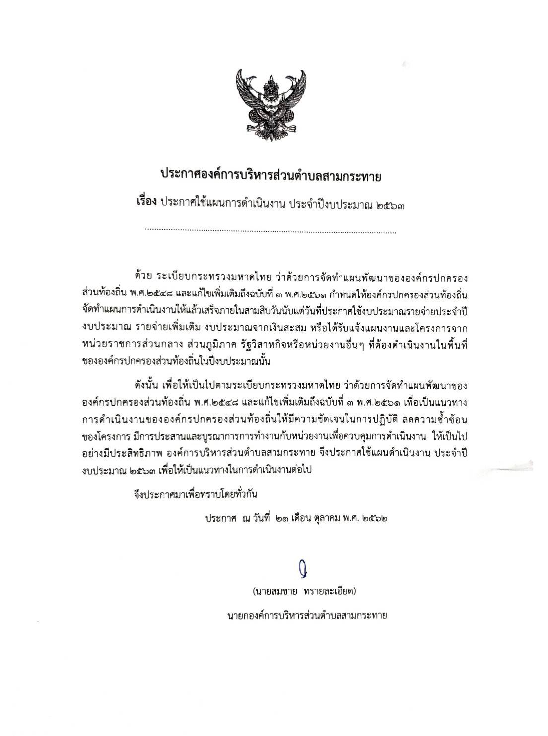 ประกาศใช้แผนการดำเนินงาน ประจำปีงบประมาณ ๒๕๖๓