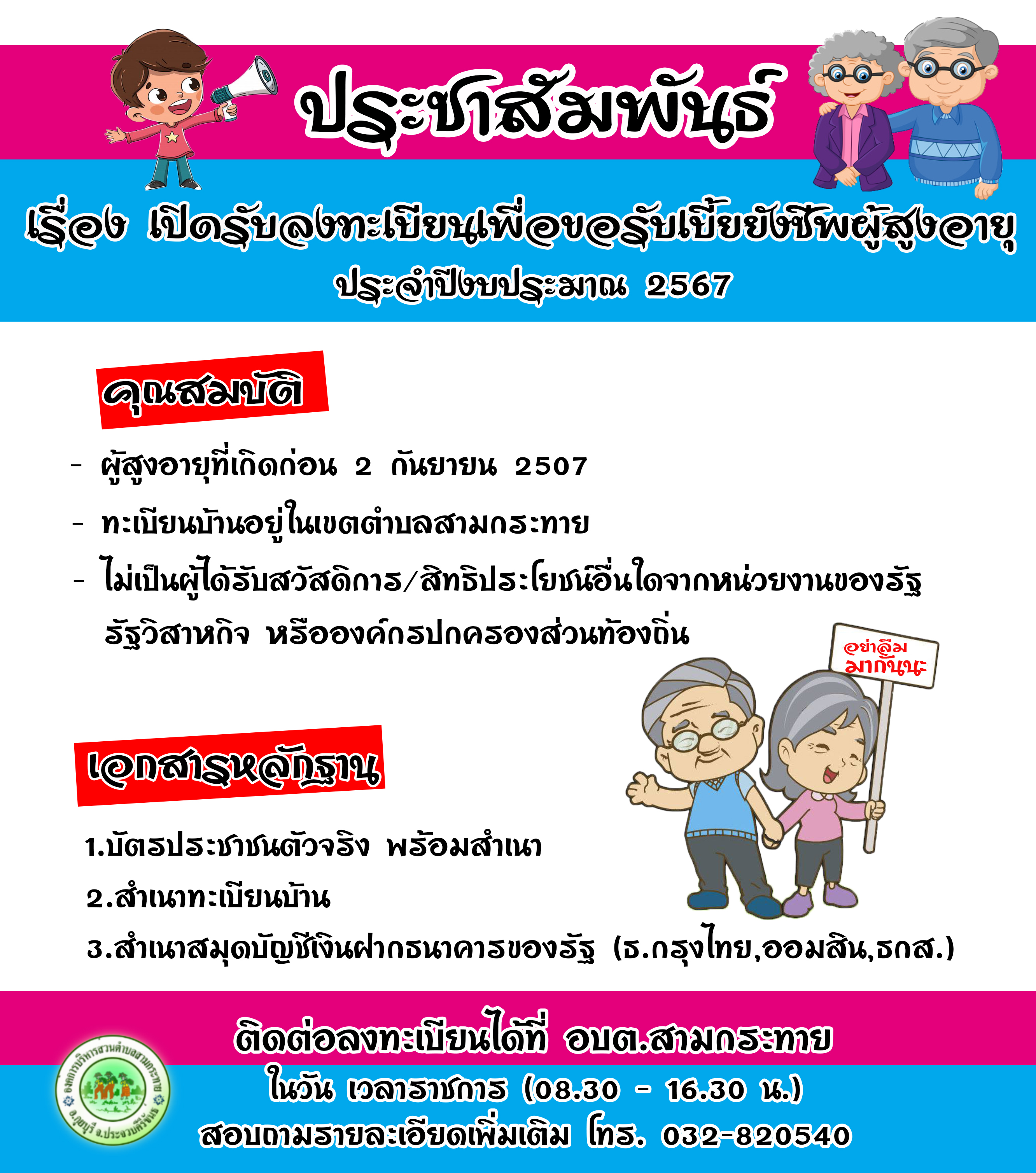 ประชาสัมพันธ์ เปิดรับลงทะเบียนเพื่อขอรับเบี้ยยังชีพผู้สูงอายุ ประจำปีงบประมาณ 2567